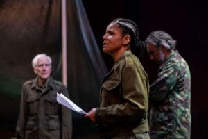 Peter Carroll is an amusing Casca, and James Lugton a typically reliable Decius Brutus. Unfortunately, the actors playing Portia (Jules Billington) and Calphurnia (Evans insists on the First Folio spelling with an “h”; Ava Madon) waste those characters’ two momentous speeches: Portia’s plea to Brutus to confide in her, and Calphurnia’s hallucinogenic warning to Caesar (“A lioness hath whelped in the streets;/And graves have yawned and yielded up their dead…”). The latter stands near the pinnacle of Shakespeare’s art, and should never be squandered so wantonly.