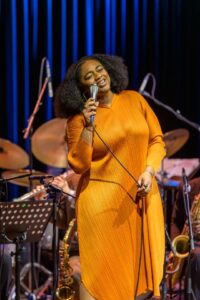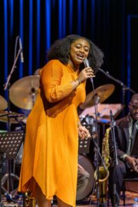 Samara Joy came out and told us that although she was recovering from a cold, she’d rather sing a few notes for us than none. Compromised she was, in range, volume and breath control. She avoided introducing songs or band members, and only performed for 45 minutes rather than the scheduled 90. This, perhaps, was the peril of long-haul flights when your instrument is your voice.